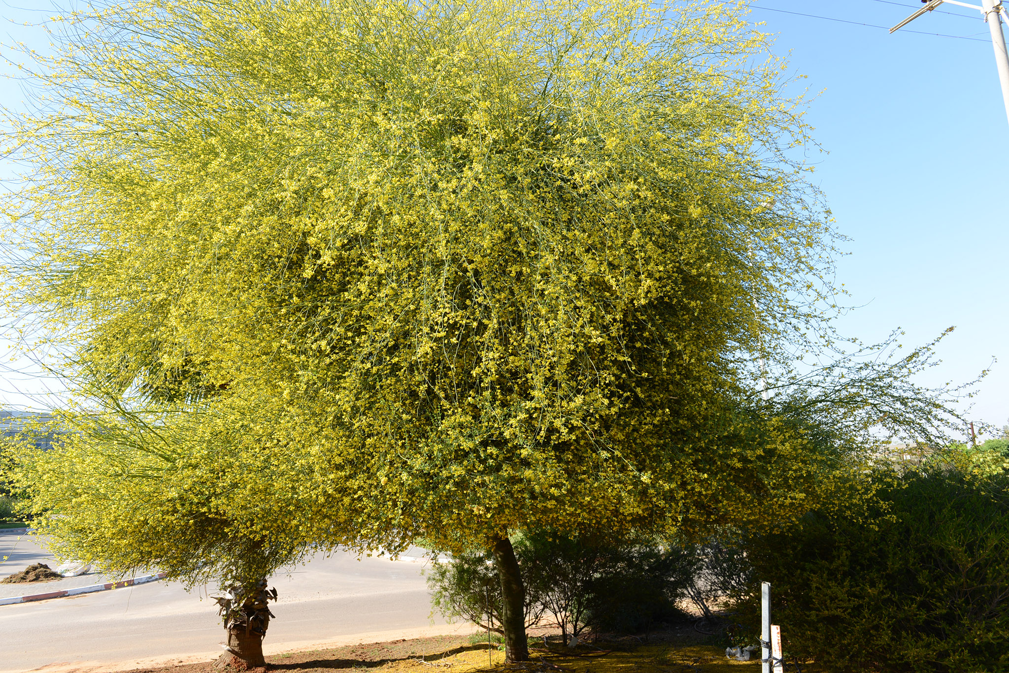 איברים דקורטיביים ותיאור כללי עץ נשיר, וותיק ולא מוכר בארץ. הוא עץ מסועף, קטן עד בינוני וצמרת עגולה. קליפת הגזע בצבע ירקרק, נוטה לגדול על מספר גזעים כאשר ענפי הצד נוטים לצימוח שרוע. הגזע של העץ הוא החלק הקישוטי והמיוחד בכל ימות השנה. הענפים בעלי קליפה בצבע ירוק והם בעלי קוצים קטנים. העלים מסורגים, קטנים, מנוצים פעמיים, 4-2 זוגות עלעלים שאורכם עד 8 מ"מ וצבעם ירוק-כחלחל. הפריחה חלה בתחילת האביב, הפרחים ערוכים במכבדים חיקיים, צבע הפרחים צהוב- זוהר, קוטר הפרח כ-2 ס"מ, הפריחה שופעת ביותר, מכסה את כל העץ, בולטת, צופנית ומושכת דבורים. בהמשך לפריחה מתפתח תרמיל דמוי סרגל, אורכו 7.5-4 ס"מ ורוחבו כ-1.5 ס"מ, צבעו חום והוא מלבין עם בשלותו. העץ משיר את עליו גם כתגובה ליובש בתחילת הקיץ ואז הגזע והענפים הירוקים עושים פוטוסינתזה. (בדומה לשיחי הרותם במדבר). השם העממי שניתן לו- Palo verde בספרדית משמעו מקל-גזע ירוק ומתייחס למופע העץ במרבית חודשי השנה, ללא עלים, כאשר הגזע והענפים בצבע ירוק ובולט.